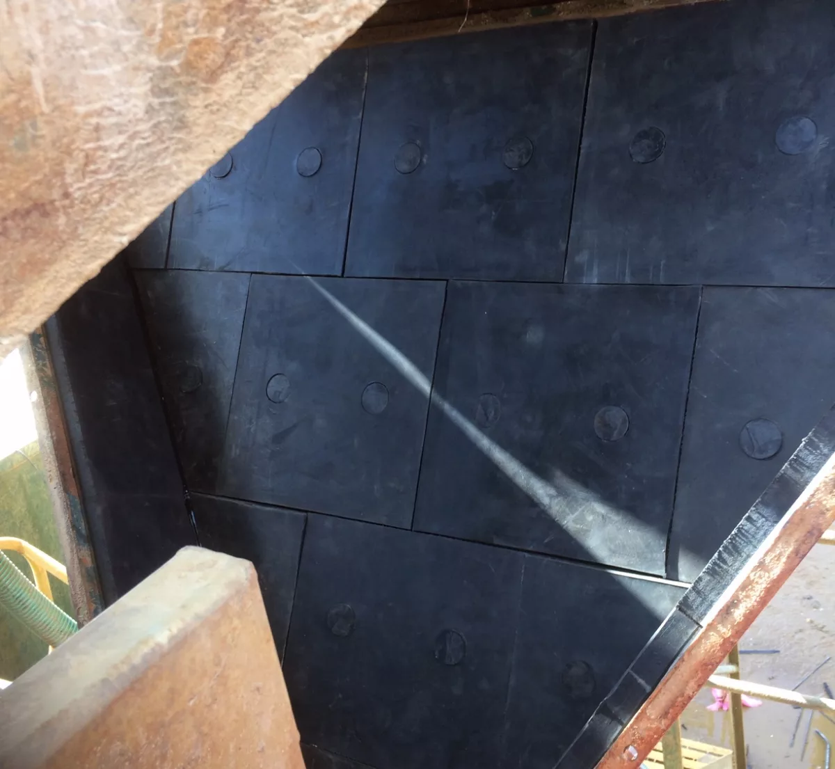 The installation in the photos is a typical screen discharge chute lined with steel backed rubber liner tiles. This installation utilises the standard 330mm square tiling system for the base of the chute and on the sides half size tile have been used. These tiling systems once installed are easy to maintain and stock spares for. The tiles are available from SCS in two different thicknesses 25+5 and 45+5mm thick.